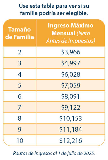 Las familias que se encuentran dentro de las categorías de ingresos para el tamaño de su familia y cumplen con los requisitos de elegibilidad pueden recibir ayuda. Use la tabla para ver si su familia podría ser elegible.
